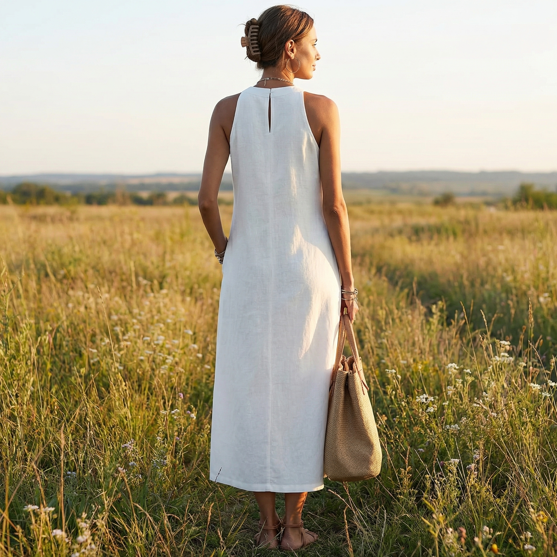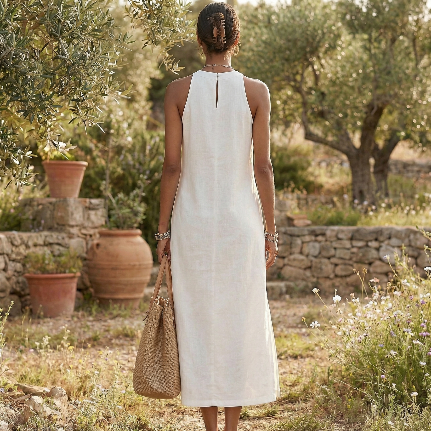 The Jimena™ dress combines a breathable linen blend with an elegant, minimalist design. Its midi cut and sophisticated mandarin collar create a refined, modern look—perfect for staying cool and stylish on hot days.